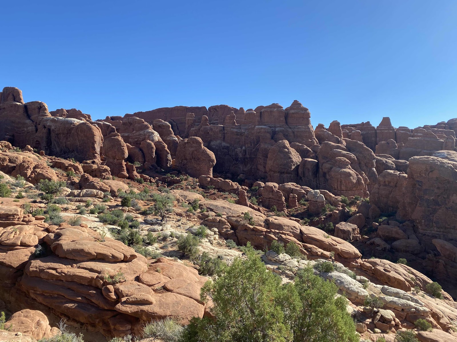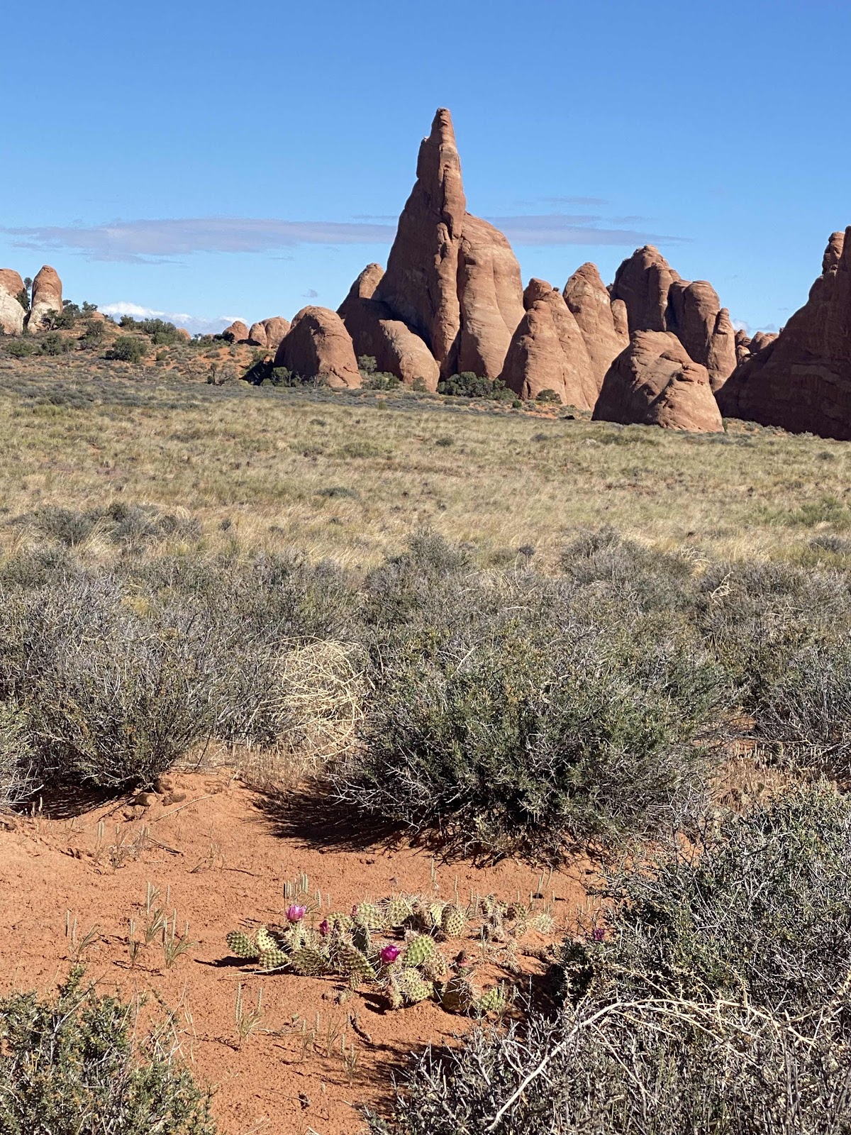 Day 4 (May 30, 2022) We got up early this morning as we had a 7:00 am reservation to enter Arches National Park. Our plan was to get some hiking in before the day got too hot. This time of year can be hit or miss when it comes to temperatures. We got lucky that the storm blew through and cooled it down. It was still in the 50’s in the park which sounds cold, but with the sun out in a desert environment, it actually is an ideal time to hike. We started with a short hike to the Delicate Arch overlook. The hike to the arch itself we were saving for another day. This iconic arch is frequently on posters associated with Arches.
